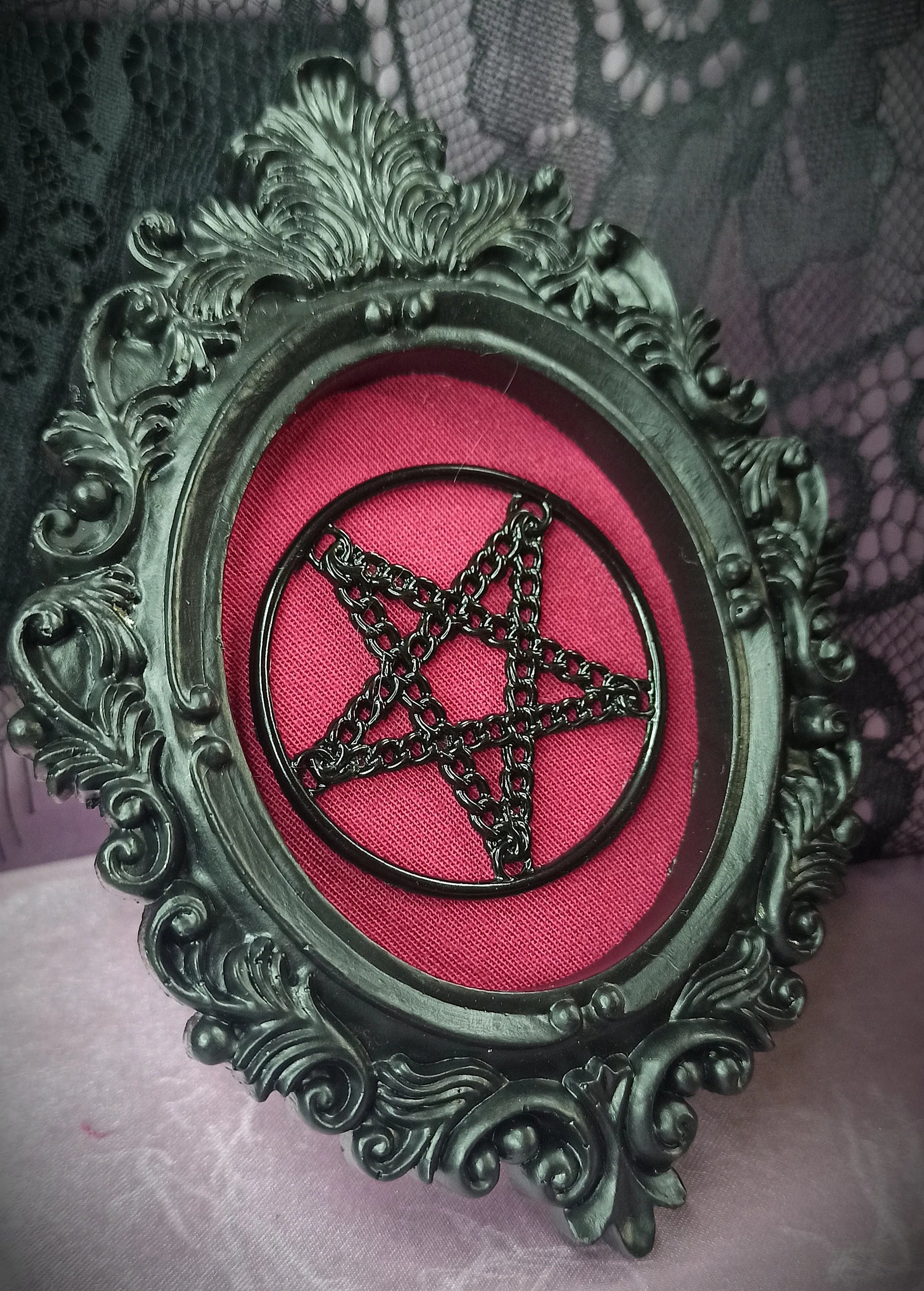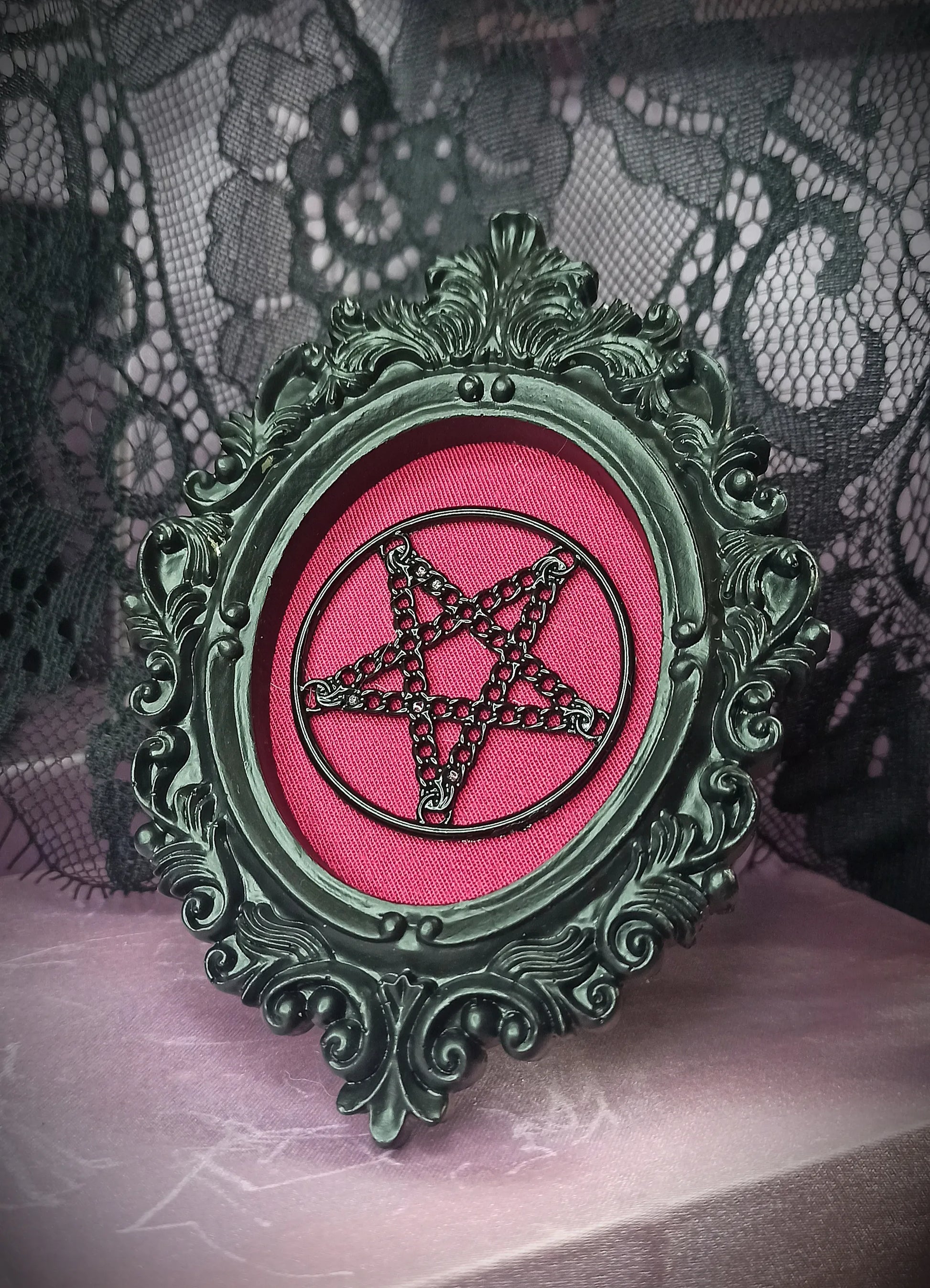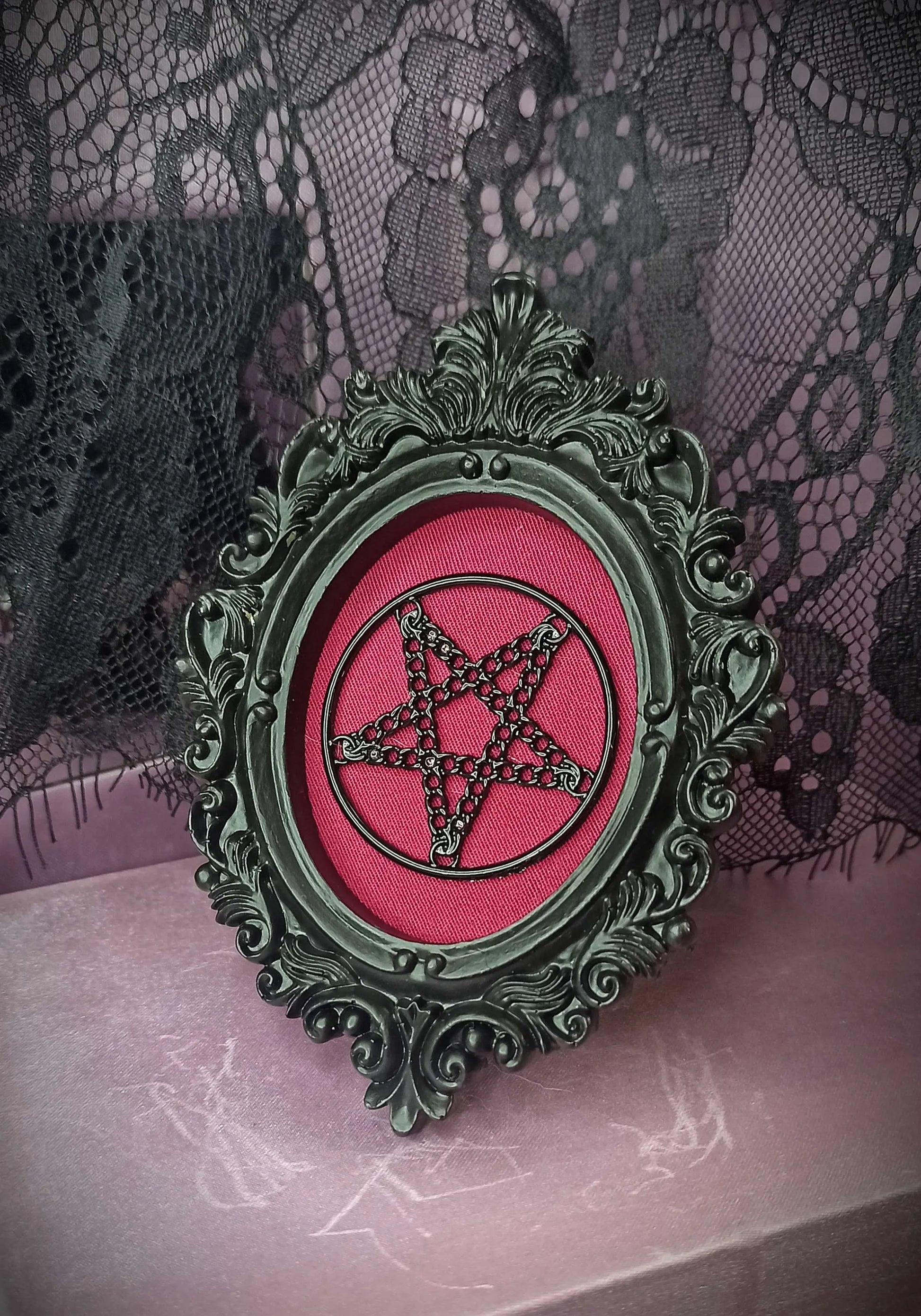 Ce cadre est composé d'un fond en coton bordeaux créant un contraste parfait avec l'élément central : un pentagramme noir à maillon de chaine magnifiquement mis en scène. Apportant une dimension artistique et macabre à l'ensemble.