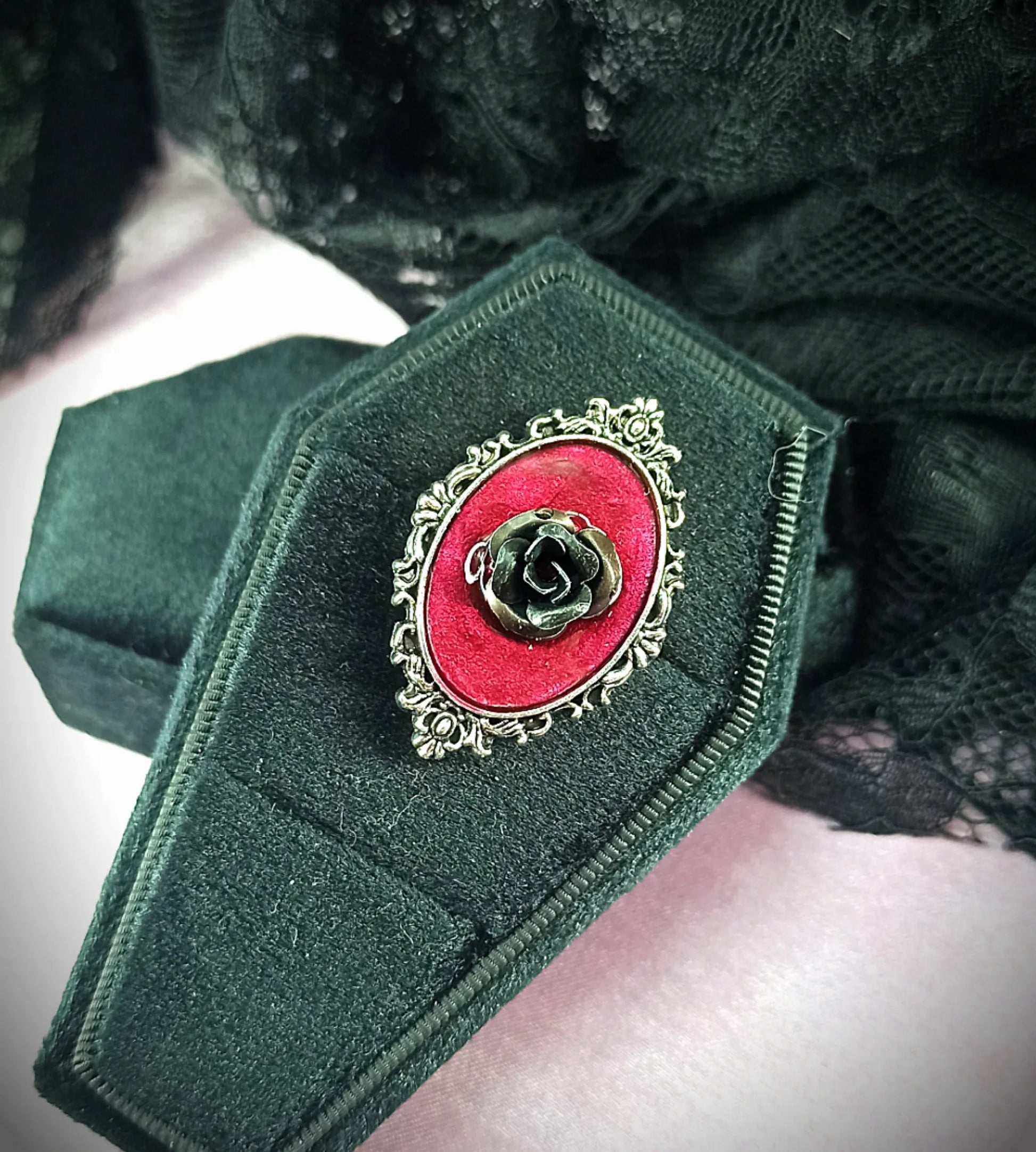 Bague gothique réglable – Rose noire sur fond bordeaux fait main