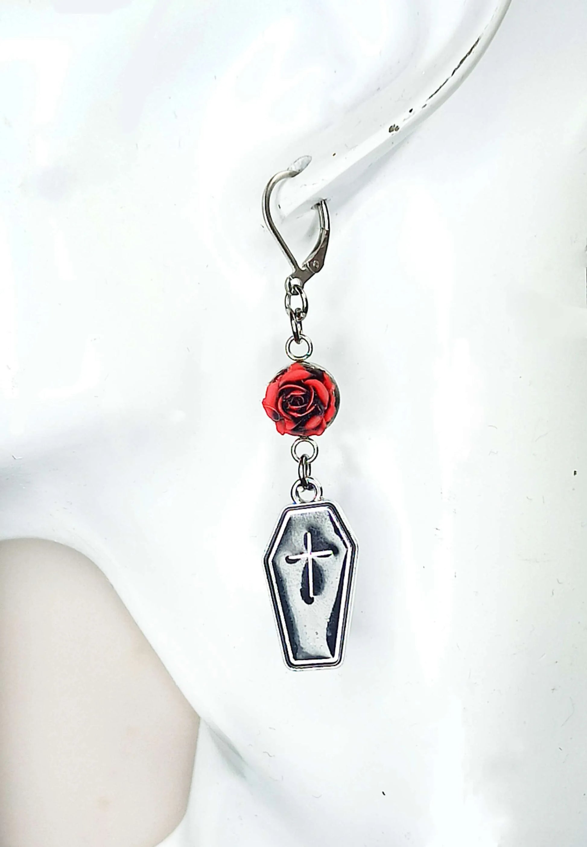Boucle d’oreille gothique romantique avec rose rouge et cercueil argenté – Pièce unique artisanale