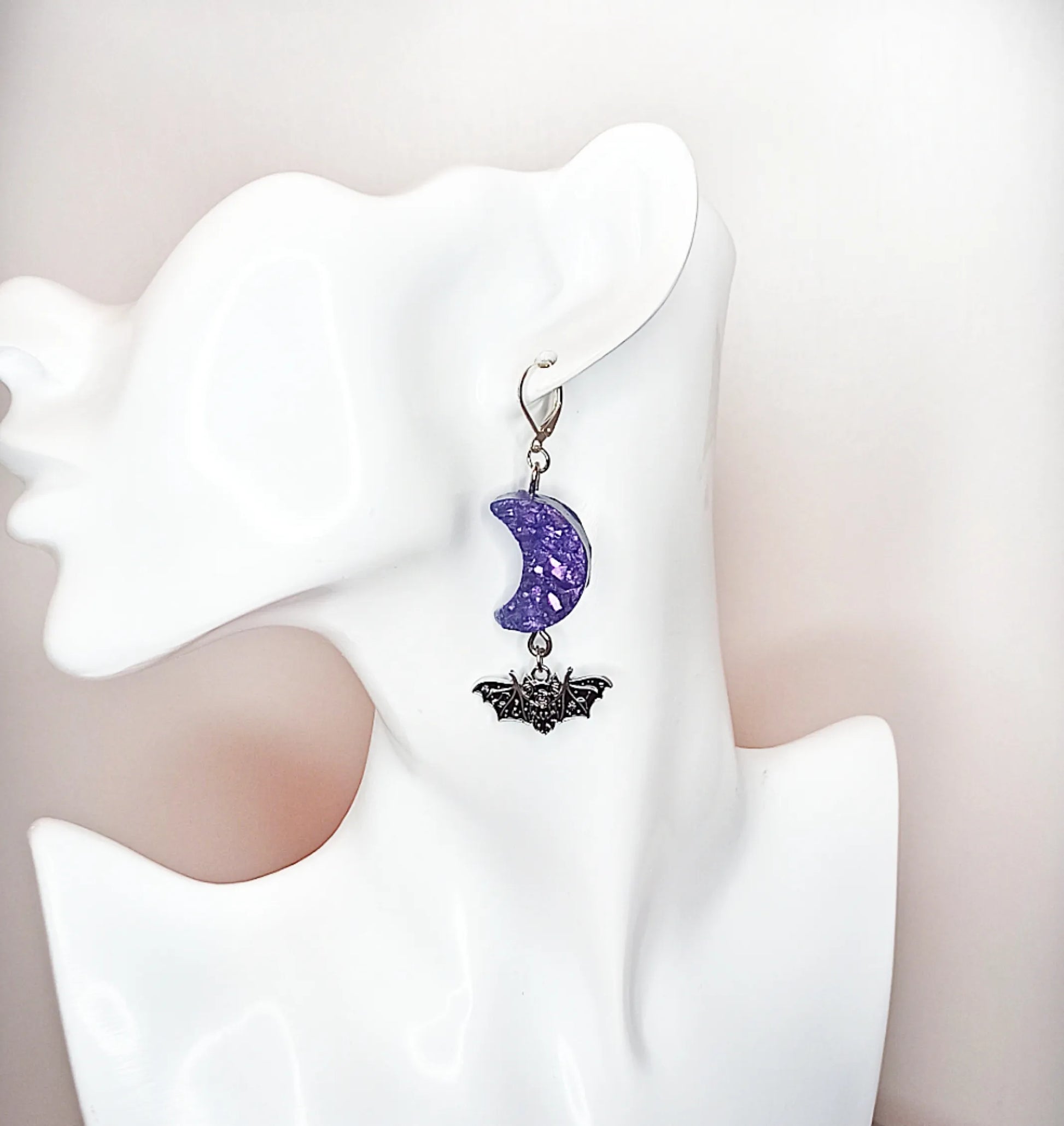 Boucles d'oreilles gothiques "Lune & Chauve-souris" en résine violette – Fermoir en argent 925 – Pièce unique, fait main