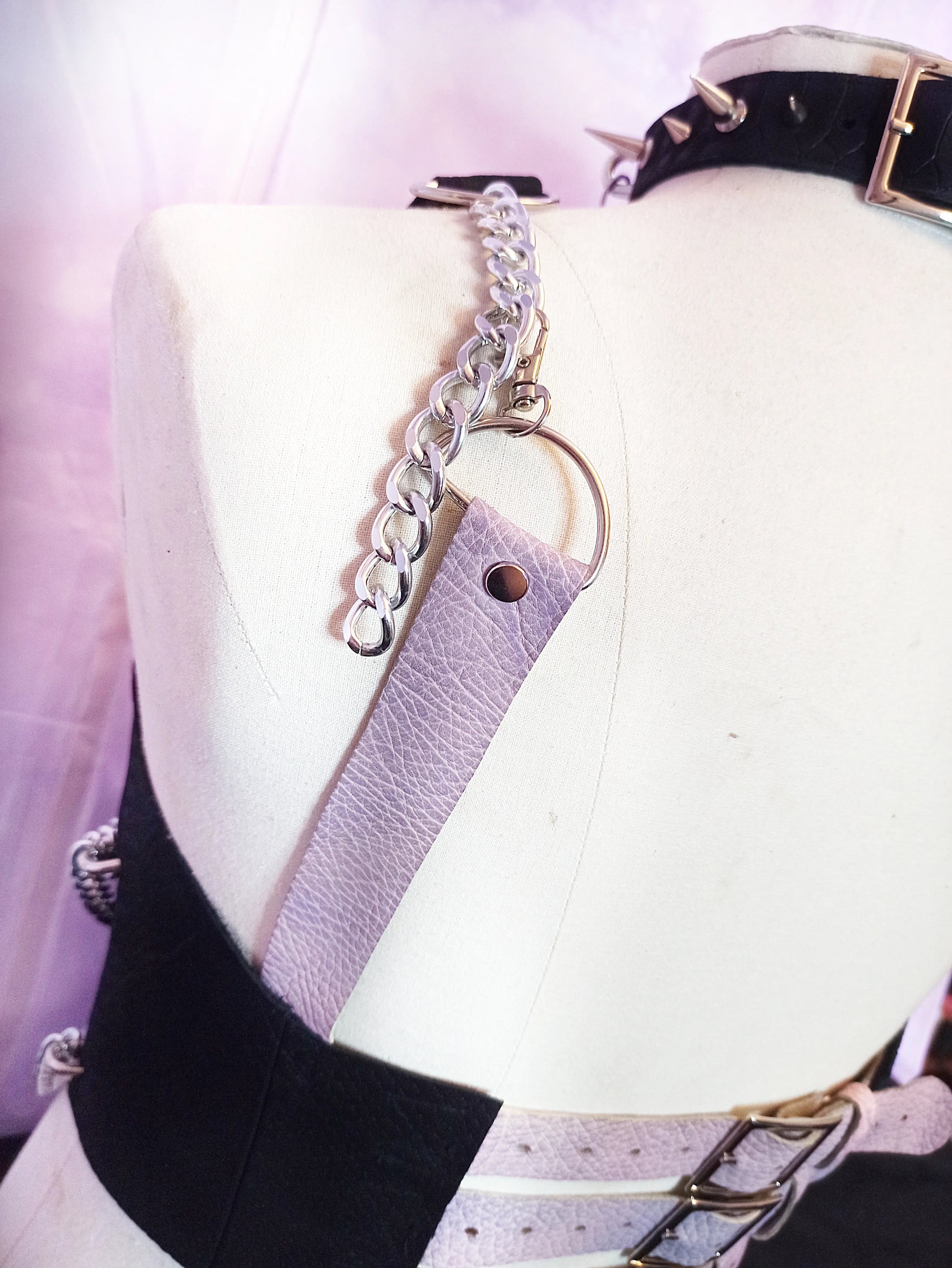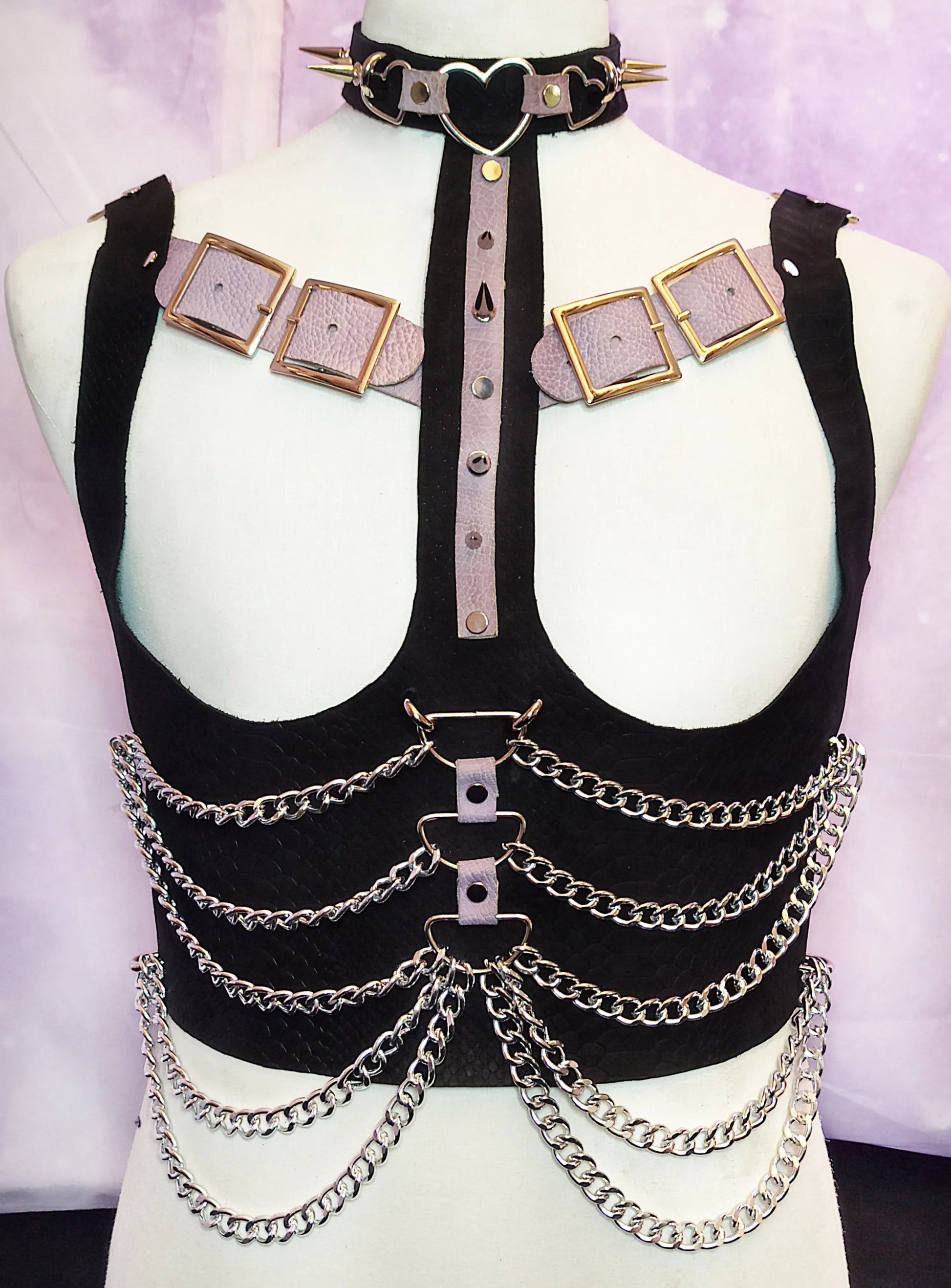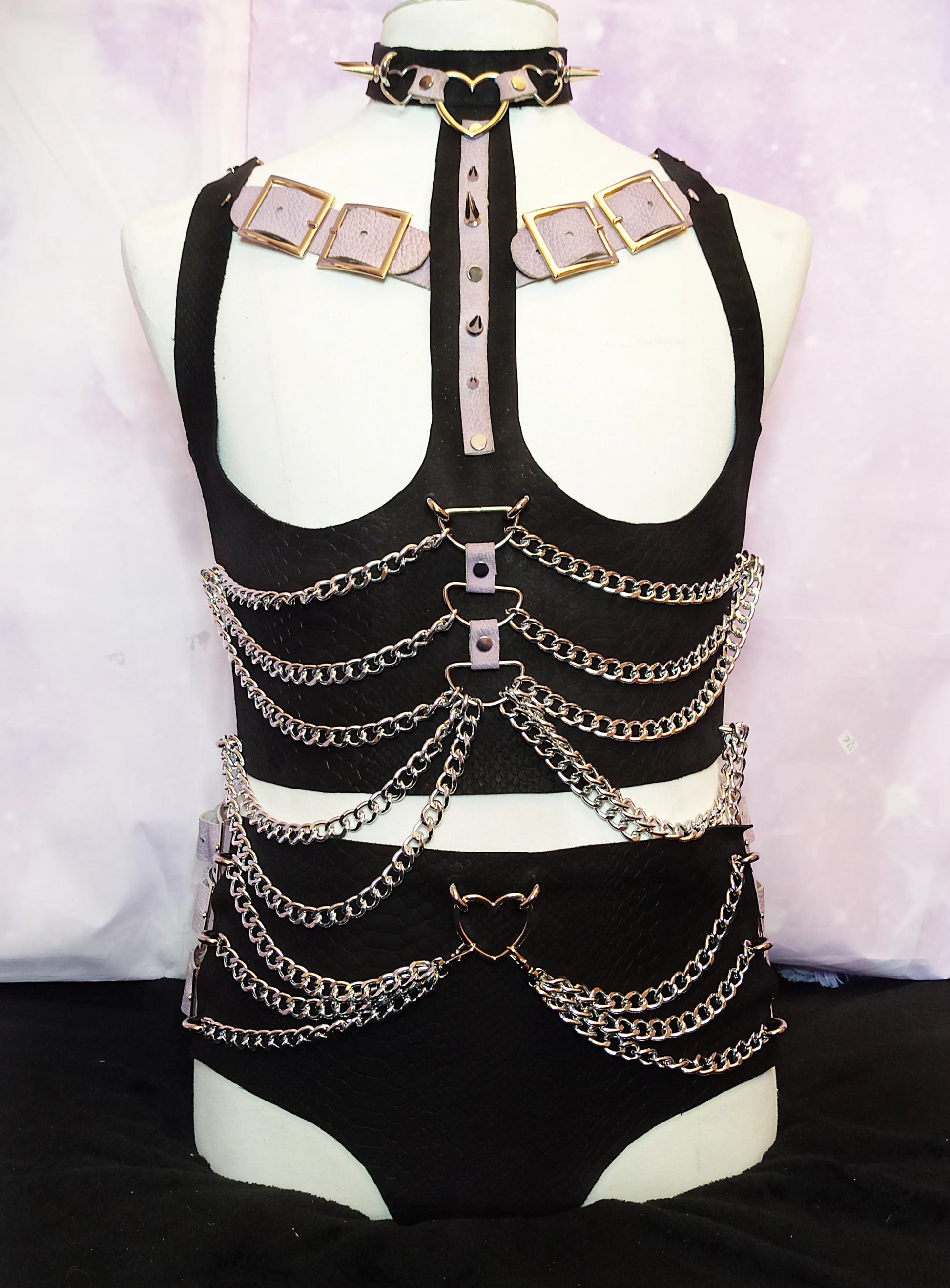 ✨ Avec son cuir noir effet peau de serpent subtilement texturé et ses accents en cuir violet pastel, cet ensemble marie brutalité chic et douceur alternative. Les chaînes, cœurs, clous et D-rings en acier inoxydable créent un jeu de contrastes visuels et sensoriels absolument envoûtant.