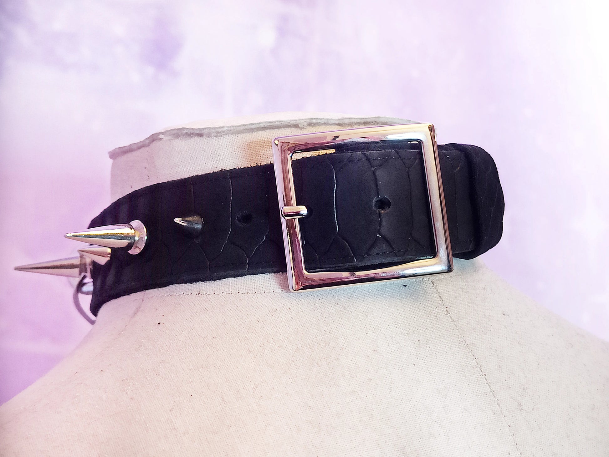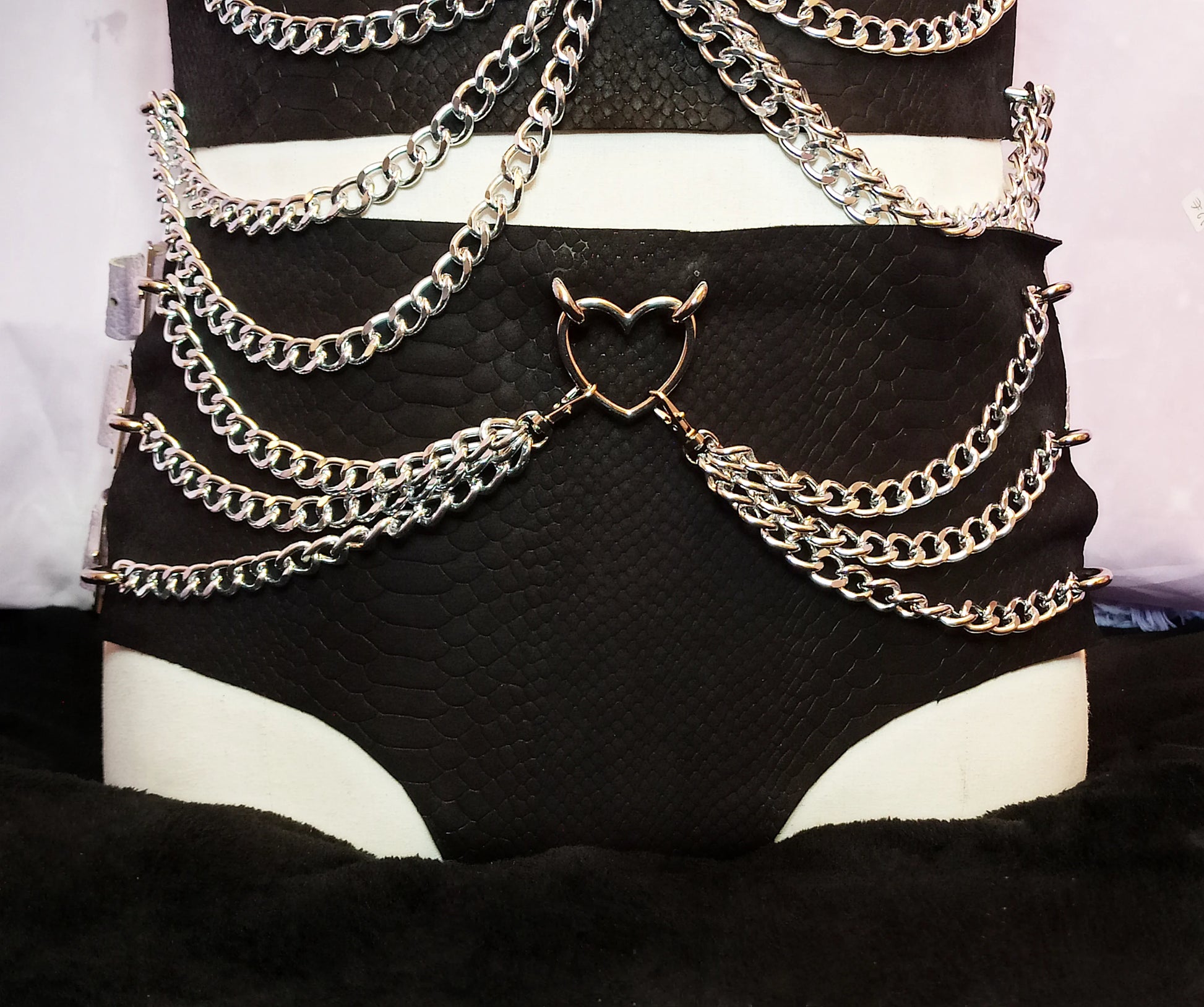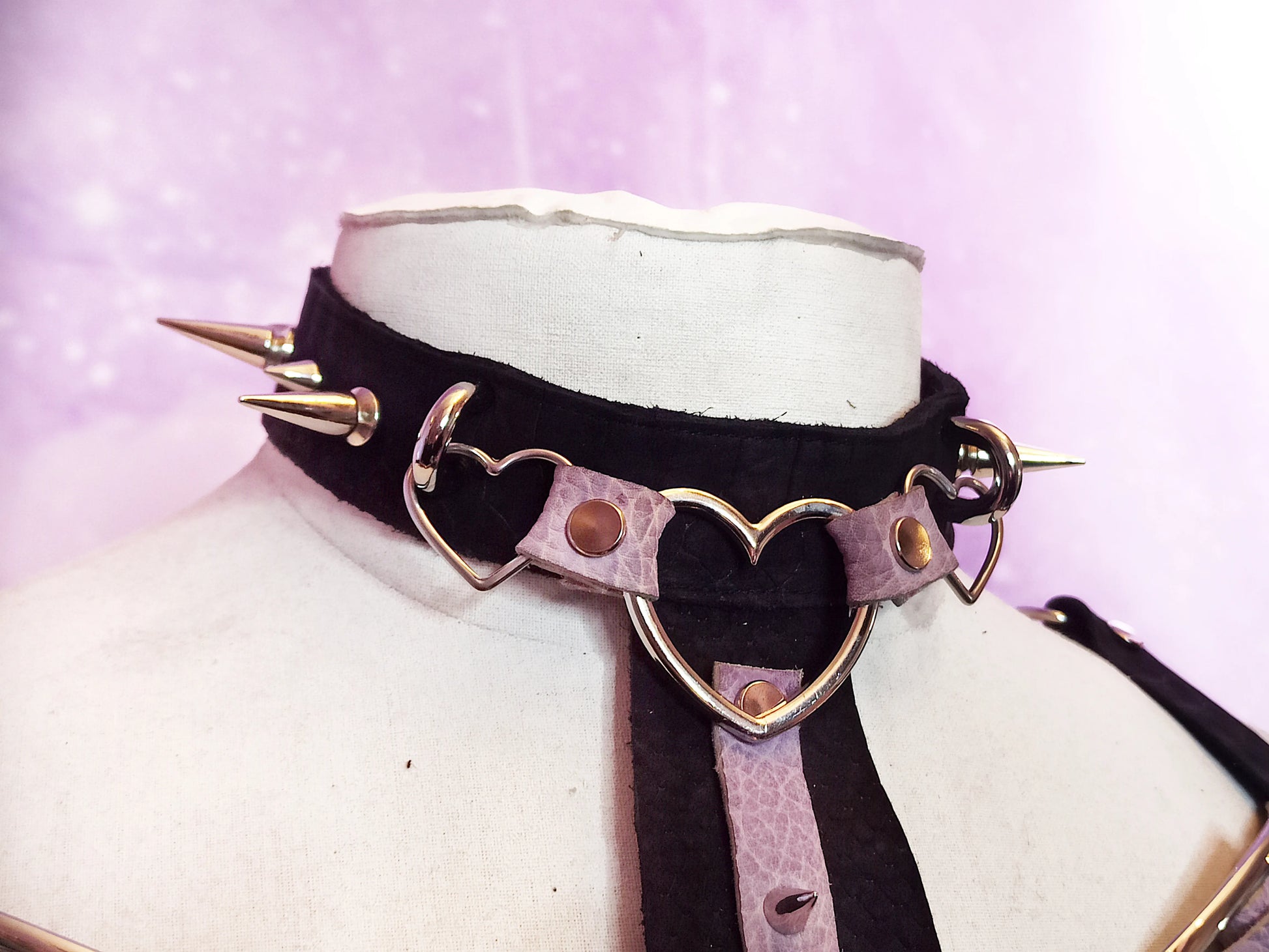 ✨ Avec son cuir noir effet peau de serpent subtilement texturé et ses accents en cuir violet pastel, cet ensemble marie brutalité chic et douceur alternative. Les chaînes, cœurs, clous et D-rings en acier inoxydable créent un jeu de contrastes visuels et sensoriels absolument envoûtant.