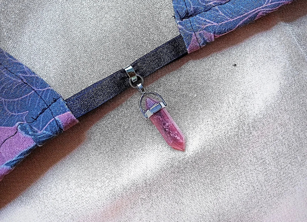 Le soutien-gorge est orné d’un véritable pendentif en améthyste, pierre de sagesse, d’intuition et de protection. Placée au centre de ton cœur, elle devient talisman et bijou à la fois. En plus, un choker noir est inclus avec l’ensemble, pour un style encore plus affirmé, presque rituel.