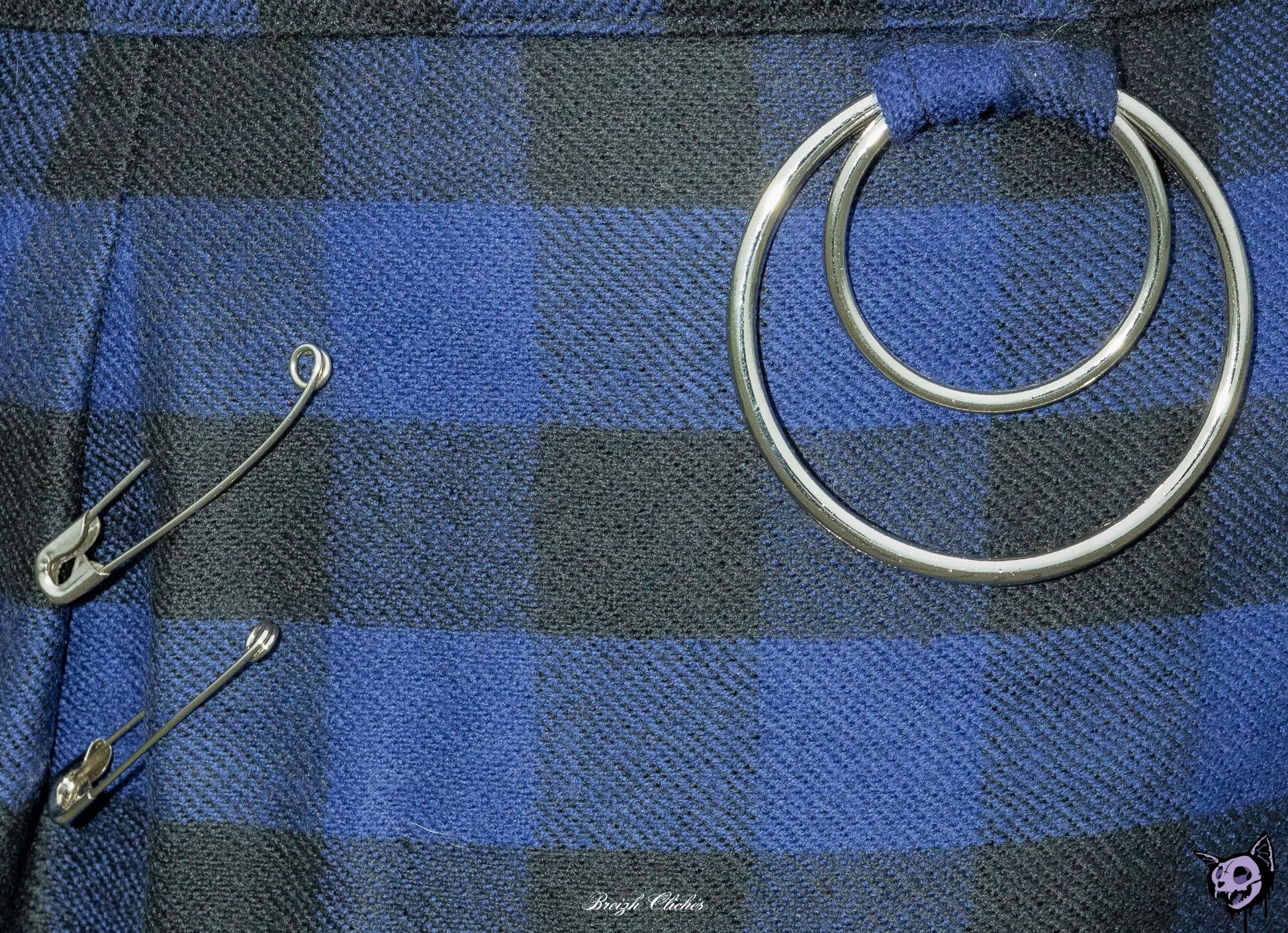 Jupe droite grunge goth en lainage bleu à carreaux noirs avec chaînes – Pièce unique faite main