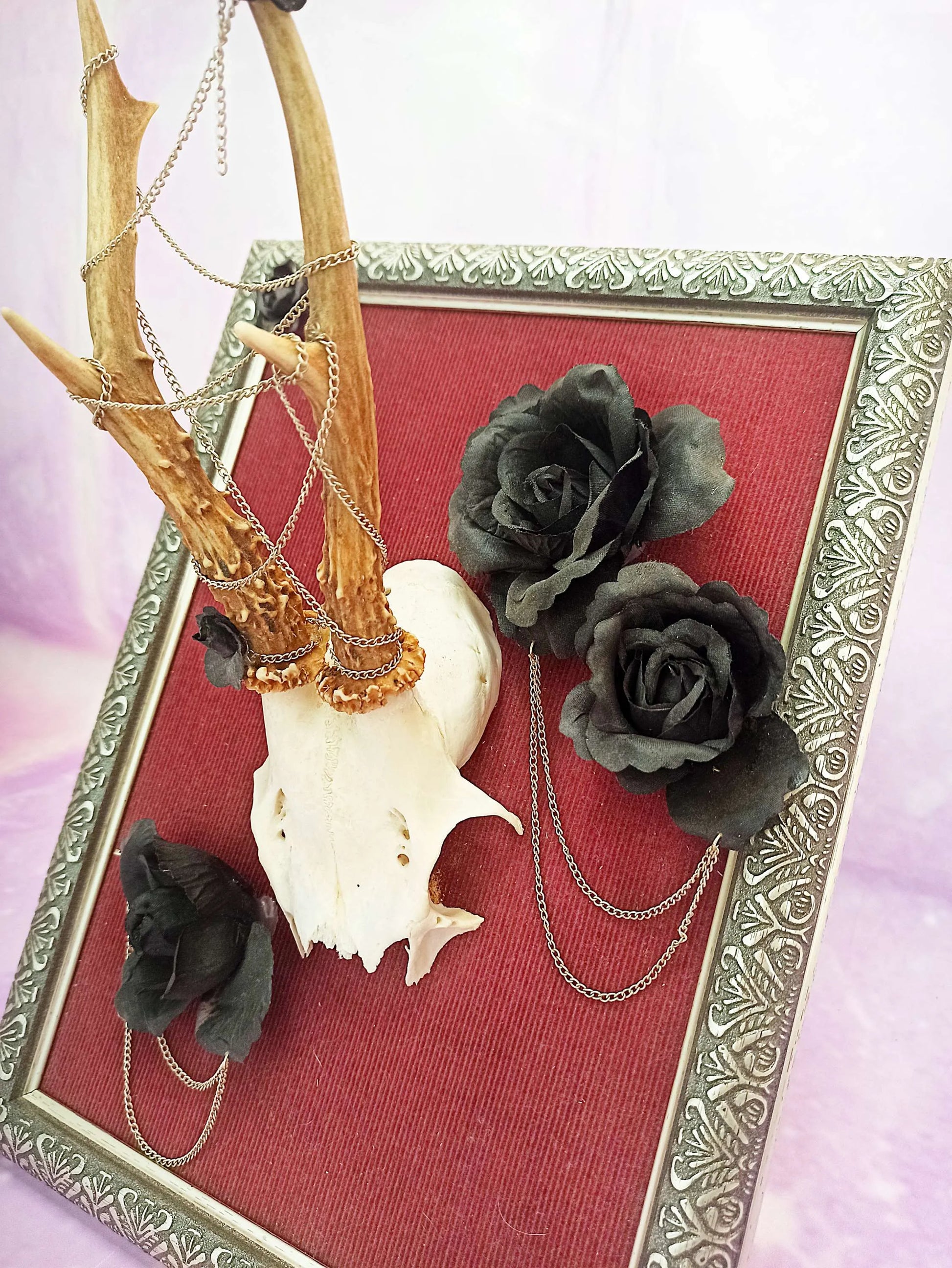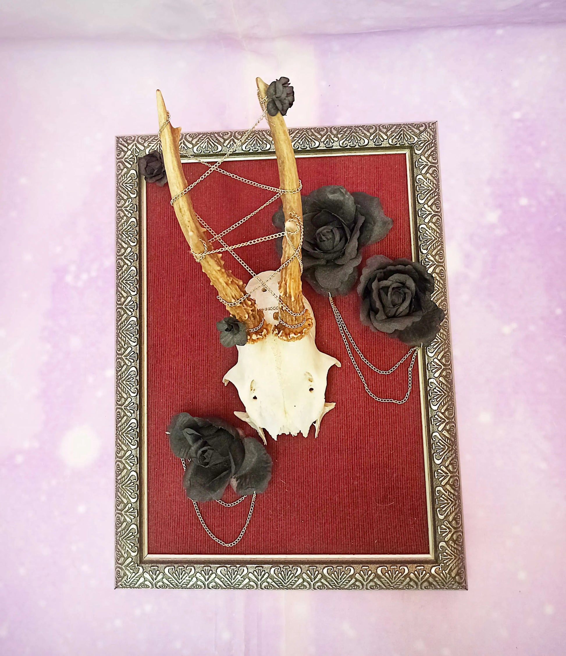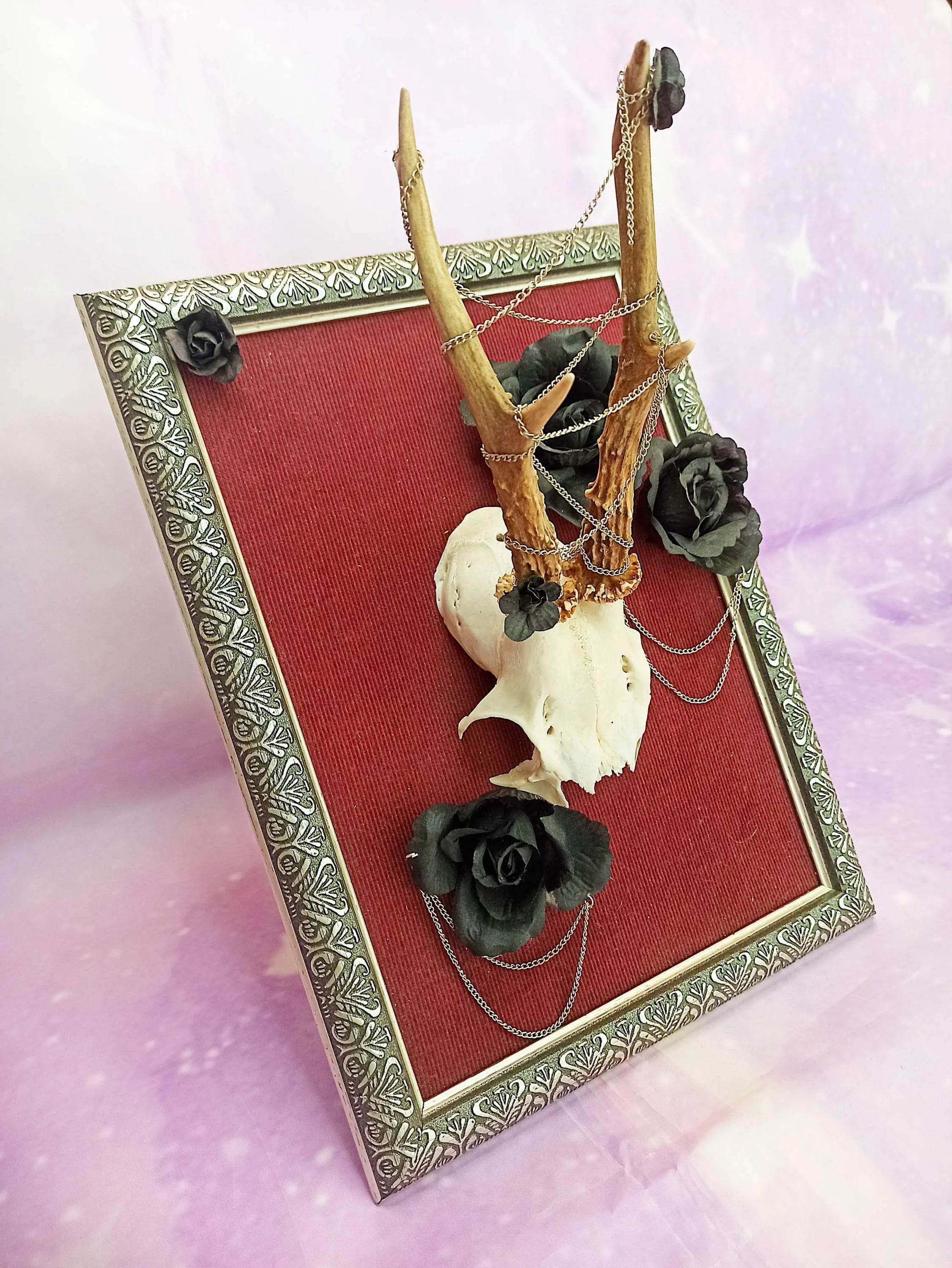 Ce cadre est composé d'un fond en velours côtelé bordeaux, créant un contraste parfait avec l'élément central : un massacre de chevreuil magnifiquement mis en scène. Autour des bois du chevreuil, de fausses roses noires et des chaînettes sont soigneusement disposées, apportant une dimension artistique et macabre à l'ensemble.