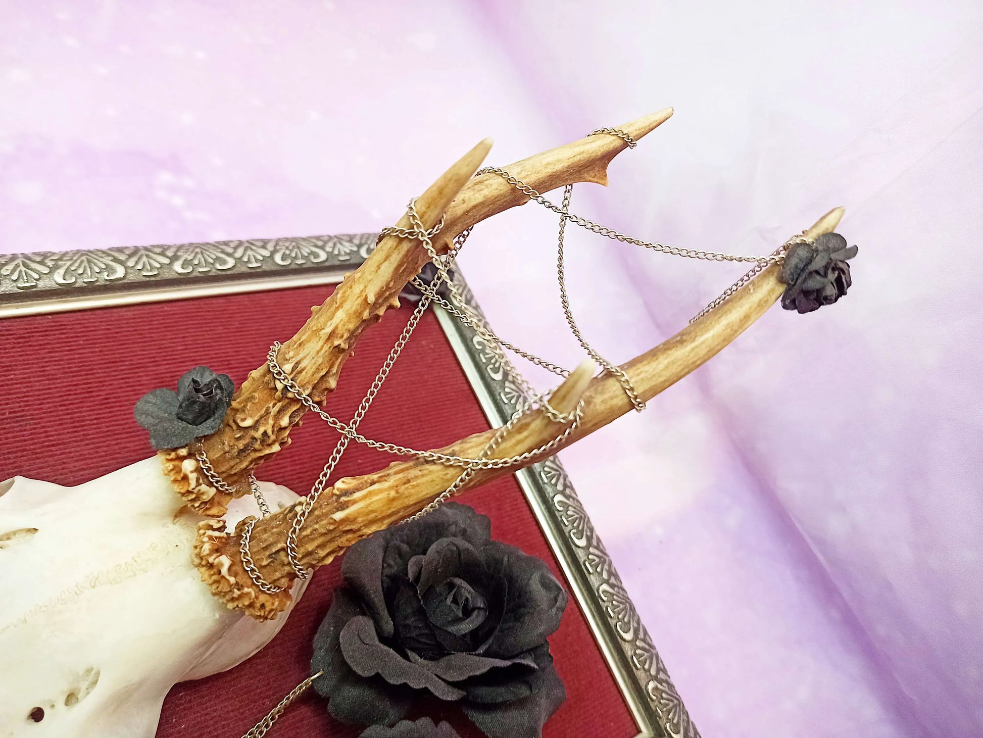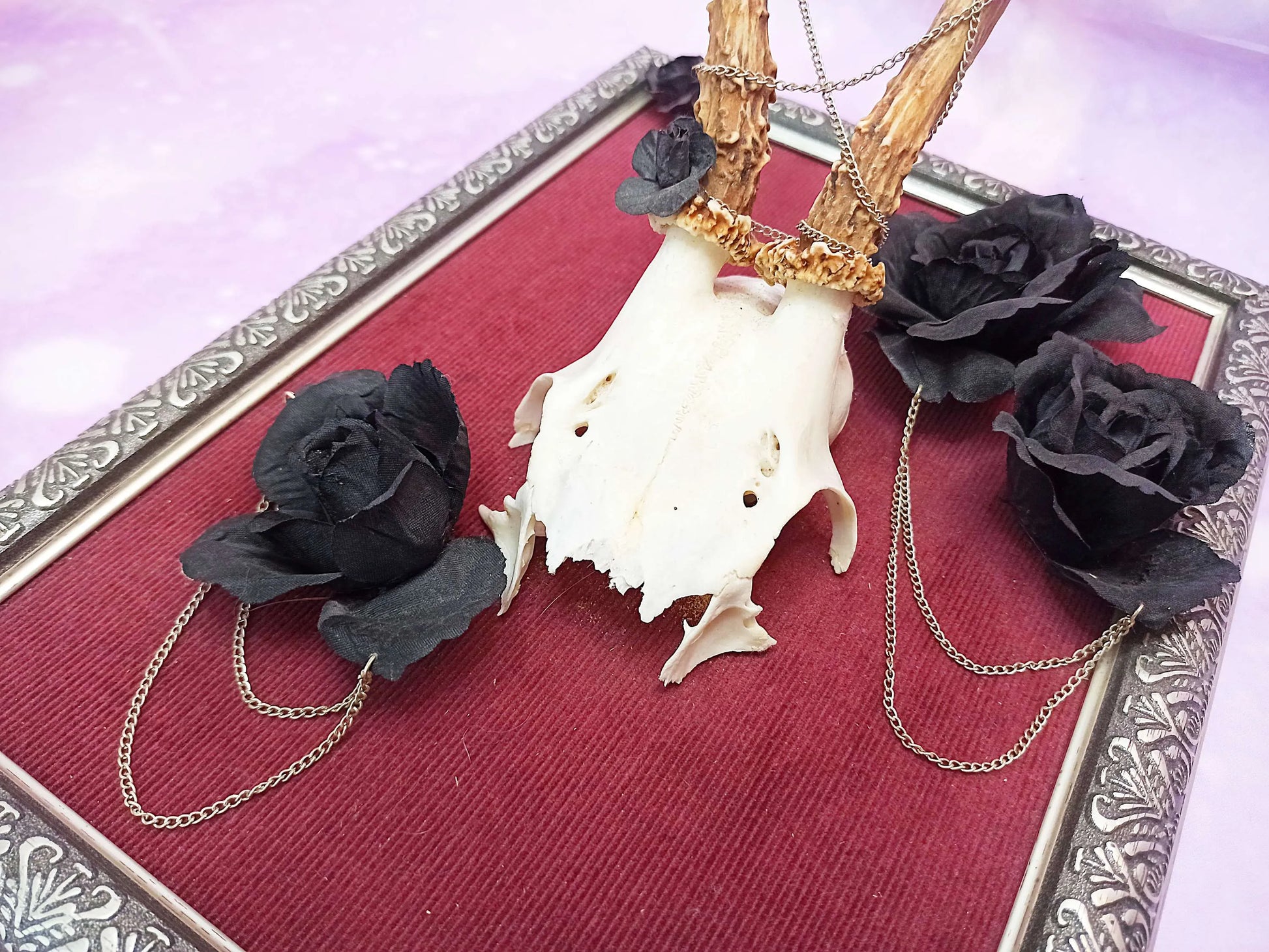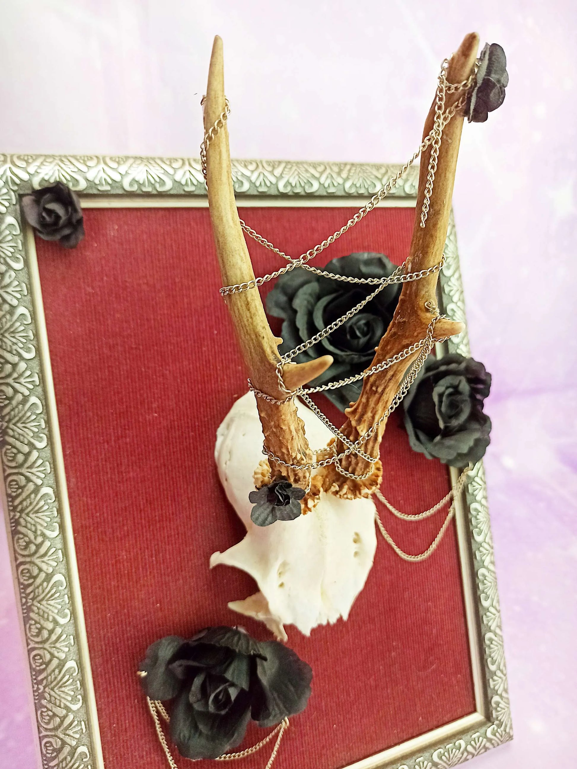 Ce cadre est composé d'un fond en velours côtelé bordeaux, créant un contraste parfait avec l'élément central : un massacre de chevreuil magnifiquement mis en scène. Autour des bois du chevreuil, de fausses roses noires et des chaînettes sont soigneusement disposées, apportant une dimension artistique et macabre à l'ensemble.