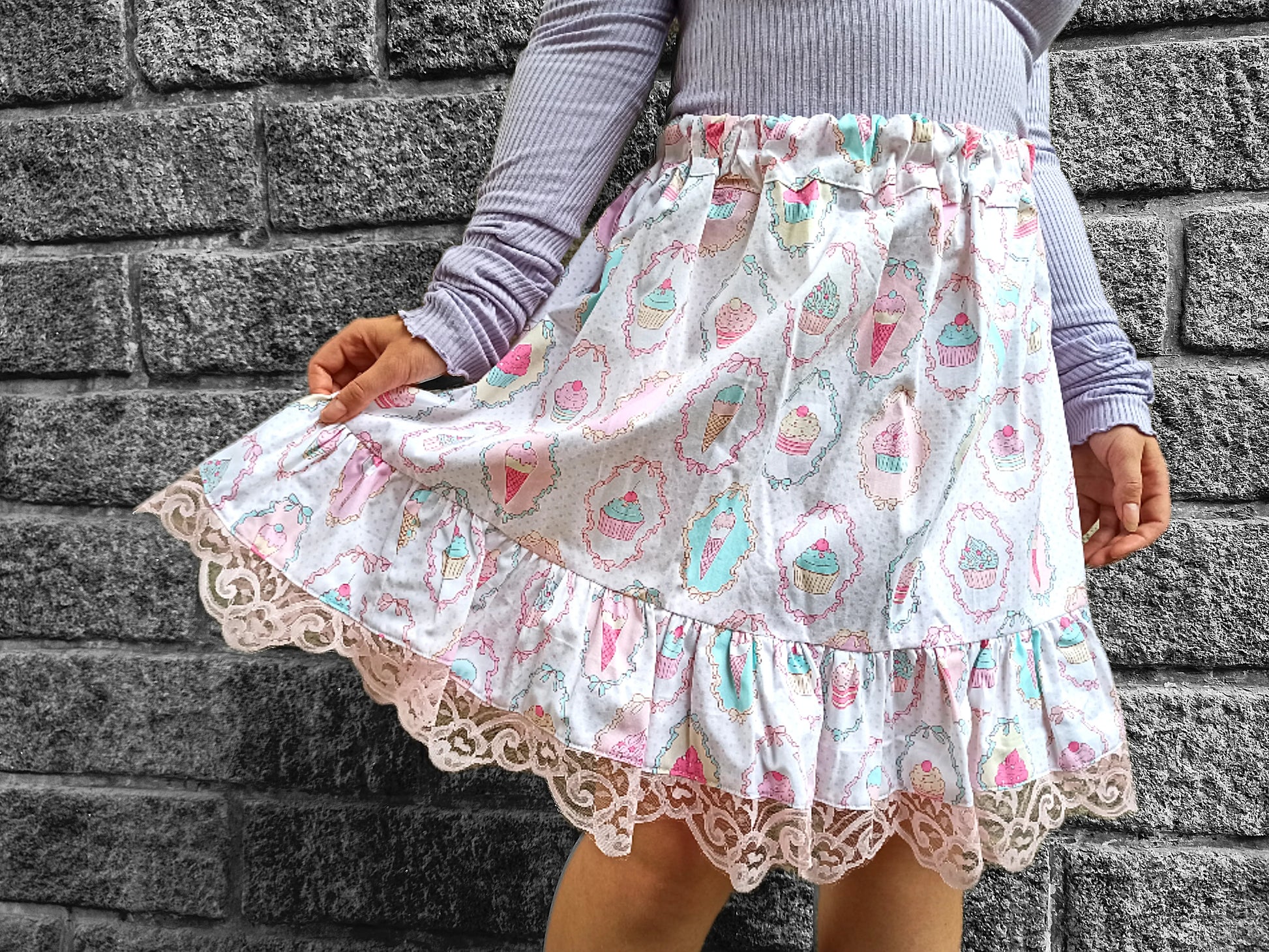 ✨ Confectionnée en coton de haute qualité, cette jupe légère et fluide est parsemée d’imprimés sucrés : glaces, bonbons, cupcakes... un univers pastel et joyeux à porter en toute occasion.
