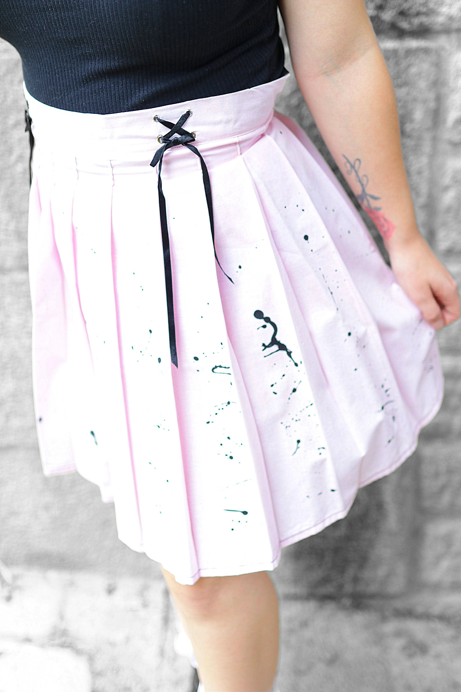 Jupe plissée pastel goth rose en coton – Éclaboussures noires peintes à la main & laçages japonisants – Fait main