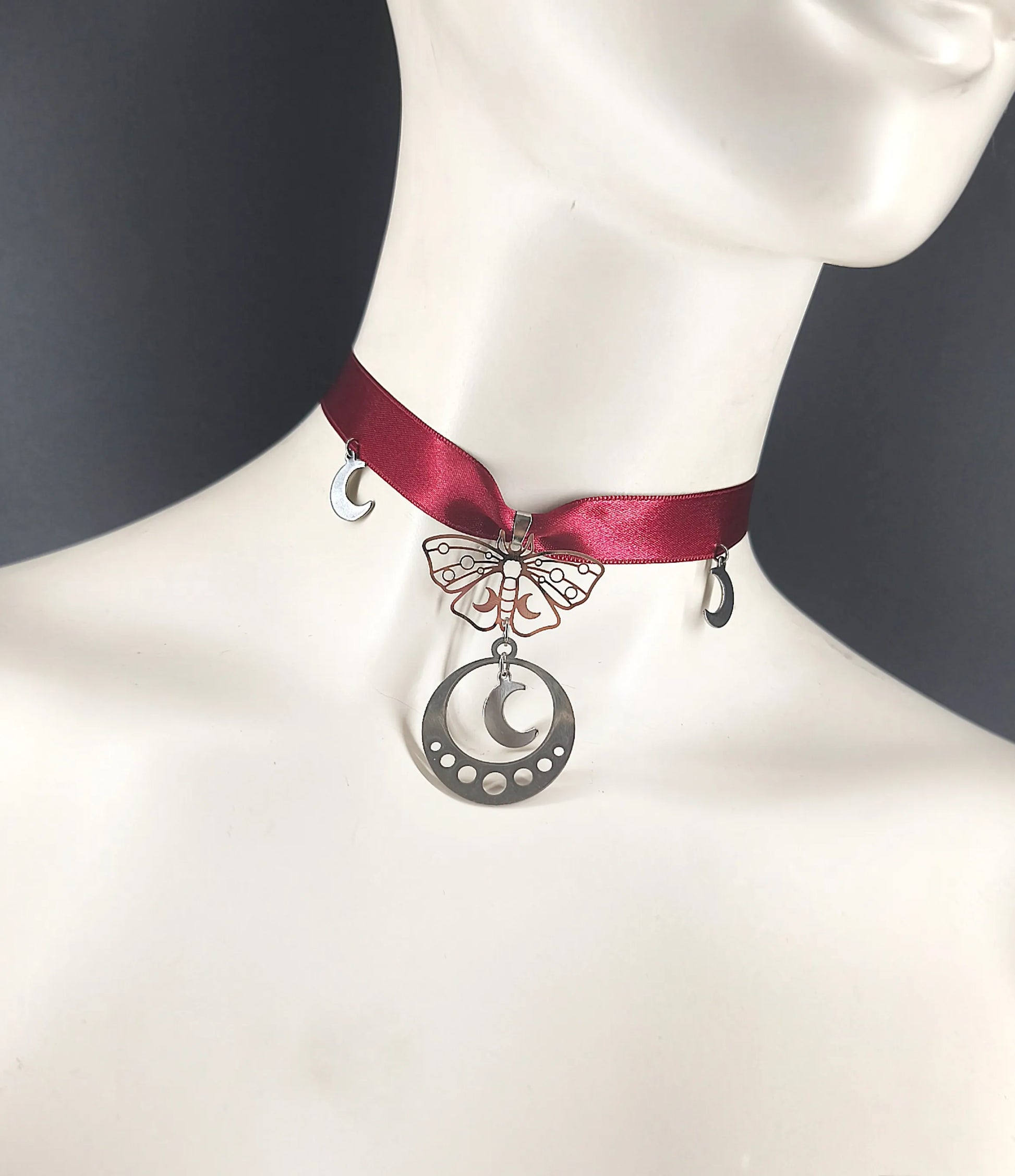 Ras de cou gothique satin bordeau, phase lunaire, lune et papillon, fait main