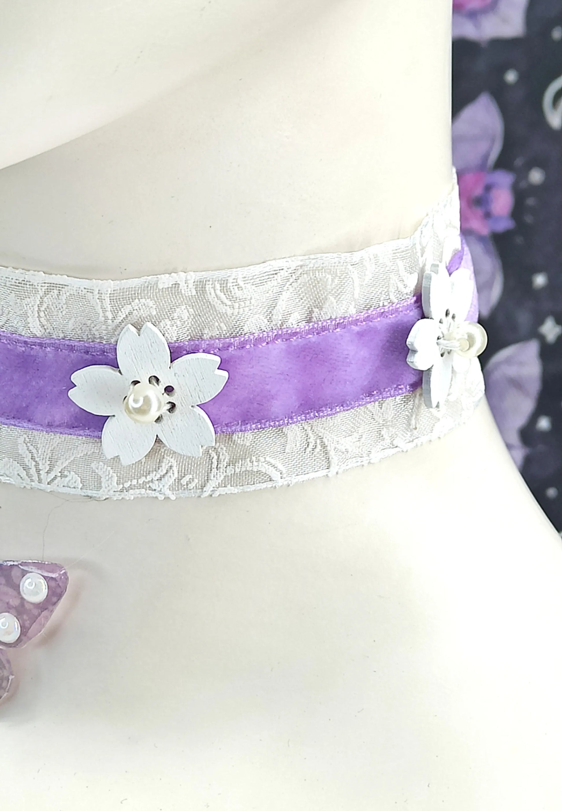 Le ruban de velours violet tendre est sublimé par une large dentelle blanche au motif floral romantique. De petites fleurs en bois peint blanc, ornées de perles acryliques nacrées, sont disposées tout autour du collier pour rappeler les cerisiers en fleurs. En son centre, un sublime pendentif papillon en organza et résine semble s’être posé délicatement, paré de sequins et suspendu à une perle nacrée.