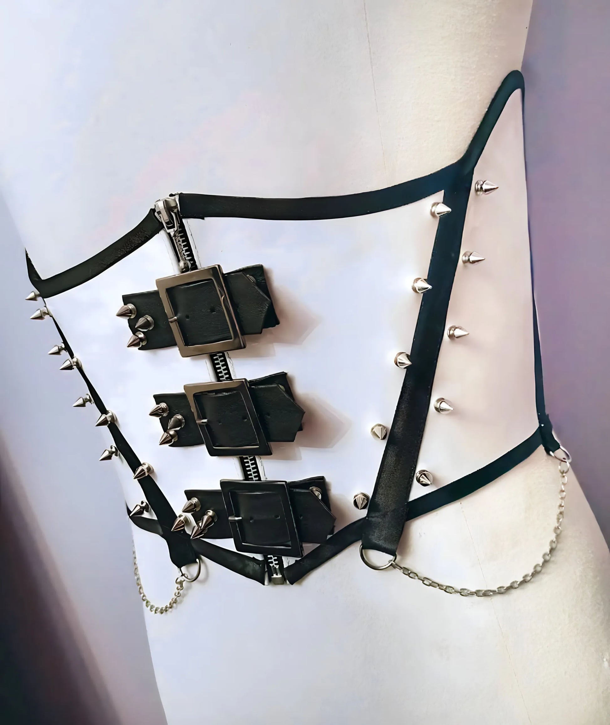 Serre-taille gothique unisexe cuir blanc vinyle – clous, chaînes & boucles – fait main
